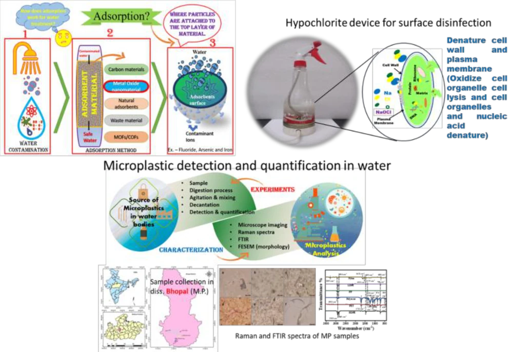 Our lab develops advanced, sustainable materials for water purification, targeting contaminants like fluoride, arsenic, iron, and harmful bacteria (e.g., E. coli) through innovative adsorbents. We’ve also created an eco-friendly hypochlorite device that produces disinfectant from salt and water, offering a cost-effective, chemical resolution for homes, hospitals, and public spaces. Additionally, we study microplastic contamination in water and ecosystems, conducting lab and field analyses, including in the Bhopal region, to understand its impact and pathways and to inform sustainable waste management strategies.